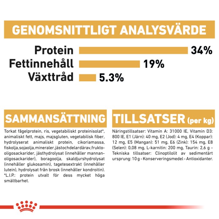 Genomsnittligt analysvärde: Protein: 34 % - Fettinnehåll: 19 % - Råaska: 6,8 % - Växttråd: 5,3 % - Per kg: Omega-3-fettsyror: 9,7 g inkl. EPA/DHA: 3,5 g.