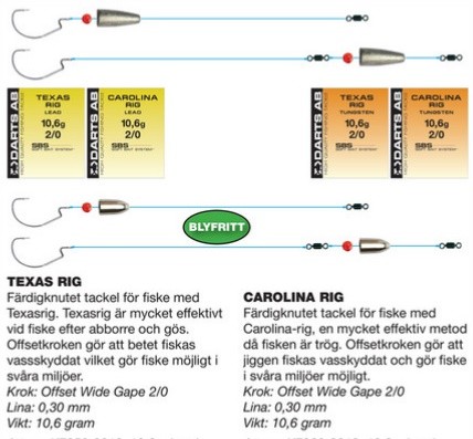 Färdigt Texasrig med 10,6 g bulletweight i tungsten och offsetkrok. Texas riggen är grymt effektiv för fisket efter gös och abborre, med sänket löst glidande på linan blir huggen tydligare och fisken känner ej motstånd på samma sätt som vid fisket med traditionell jiggskalle.